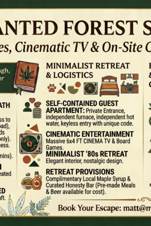 - Grown on Site: Experience the property’s unique heritage with cannabis grown right here on the grounds. If Matt’s available, he’ll gladly tell you what’s growing this year.